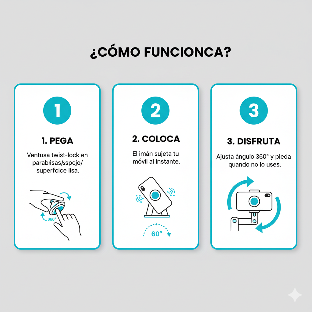 Compatible con todos los móviles, ajustable en 360°, y perfecto para coche, cocina o escritorio.